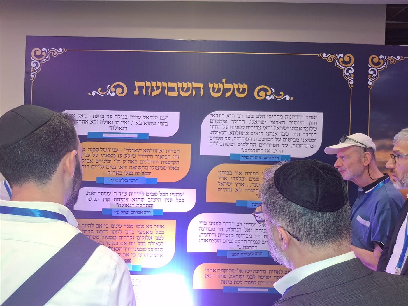 קיר אחד עסק בשלושת השבועות עם הדגשות של הדעות החולקות על סאטמר, קיר אחר עסק בחזרת עם ישראל לארצו ברישיון האומות. אי אפשר היה שלא לשים לב לציטוט אחד של הרב קוק. ואפילו המילים 'תורה ועבודה' נכתבו כאילו מדובר בסמינריון בני עקיבא ולא בכנס חרדי הפונה לציבור חרדי. יצאתי משם בלב מתרחב ובתחושת פליאה. עד לשיחה עם הרב אלי דן אחת הדמויות המשמעותיות בהסברה של הארגון.