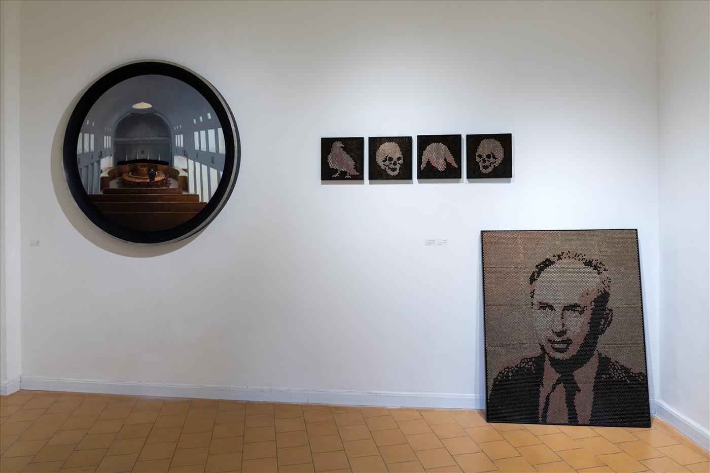 'עקידת יצחק' ו'כהנא חי' הן שמות היצירות, המעלות הרהורים מי הוא העוקד, מי הנעקד והיכן המזבח. וכאילו בכדי להשלים את התמונה על הקיר מתנוססות יצירות זהות של גולגולת וראש אייל ולצידם יונה, המורכבים אף הם מפסיפס תרמילי אקדח ריקים.