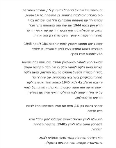 לאחר כמה ימים בהם הייתי מאושפז בבית החולים, ניסיתי לבדוק את ממדי גופי הכחוש... עם היד ניסיתי להקיף את הירך שלי. הצלחתי להקיף את הירך רק עם הבוהן והאמה. כמו שאומרים רק עור ועצמות... כל הצלעות שלי בלטו החוצה. נגעתי ביניהן ופגשתי בריאה... ממש הרגשתי אותה. הייתי בחור כמעט בן 16. הגעתי לאושוויץ שבוע לפני יום הולדתי ה15 והשתחררתי חודש בדיוק לפני יום הולדתי ה16.