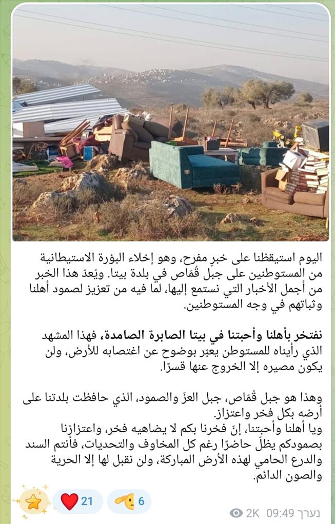 "היום התעוררנו לבשורה משמחת, והיא פינוי המאחז ההתנחלותי בהר קֻמָּאס", עדכנו בערוץ הטלגרם של הכפר את התושבים. "בשורה זו היא מן היפות ביותר ששמענו, משום שיש בה חיזוק לעמידת עמנו וליציבותם מול המתנחלים".