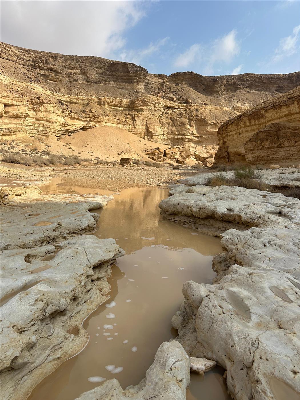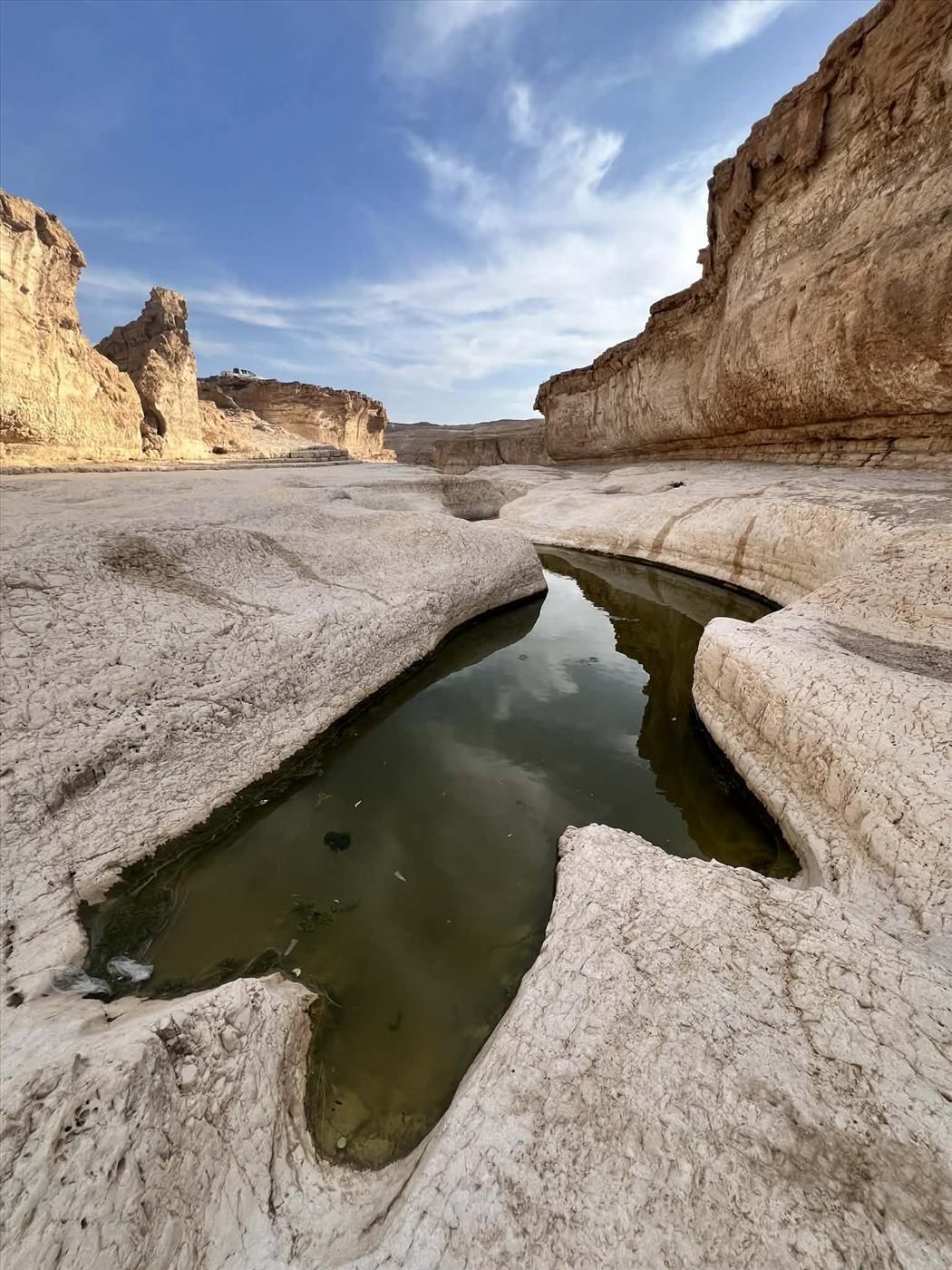 היופי כאן הוא הניגודיות: המדבר סביב צהוב וצחיח, אבל בתוך המעוק (הקניון הצר) העולם נצבע בלבן חגיגי ובכחול עמוק. כשהגבים מלאים, כמו עכשיו, הם יוצרים שרשרת של בריכות שגולשות זו לזו. בחלקן אפשר רק לשכשך רגליים, אבל הגדולות שבהן עמוקות מספיק לשחייה מלאה (וקפואה!).