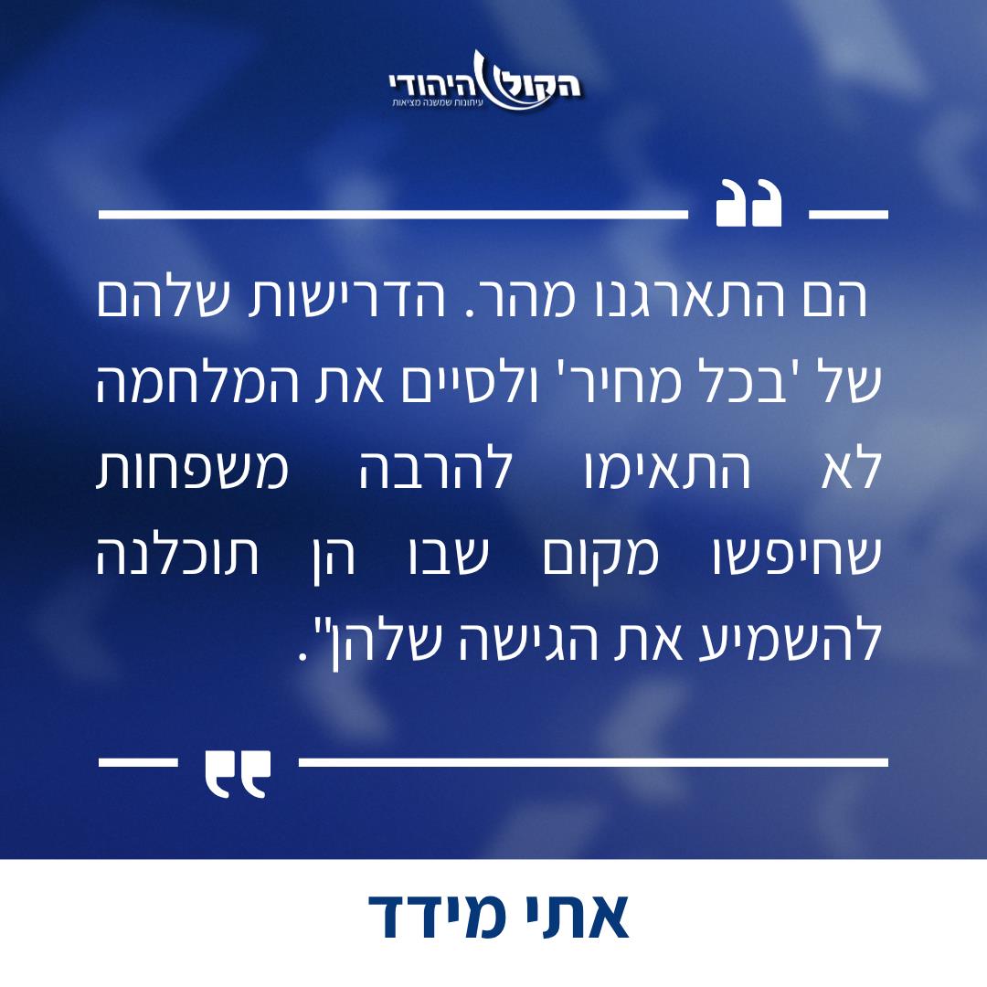 "מטה החטופים הוקם עוד בשמחת תורה עצמה", היא מזכירה. הם התארגנו מהר. הדרישות שלהם של 'בכל מחיר' ולסיים את המלחמה לא התאימו להרבה משפחות שחיפשו מקום שבו הן תוכלנה להשמיע את הגישה שלהן".