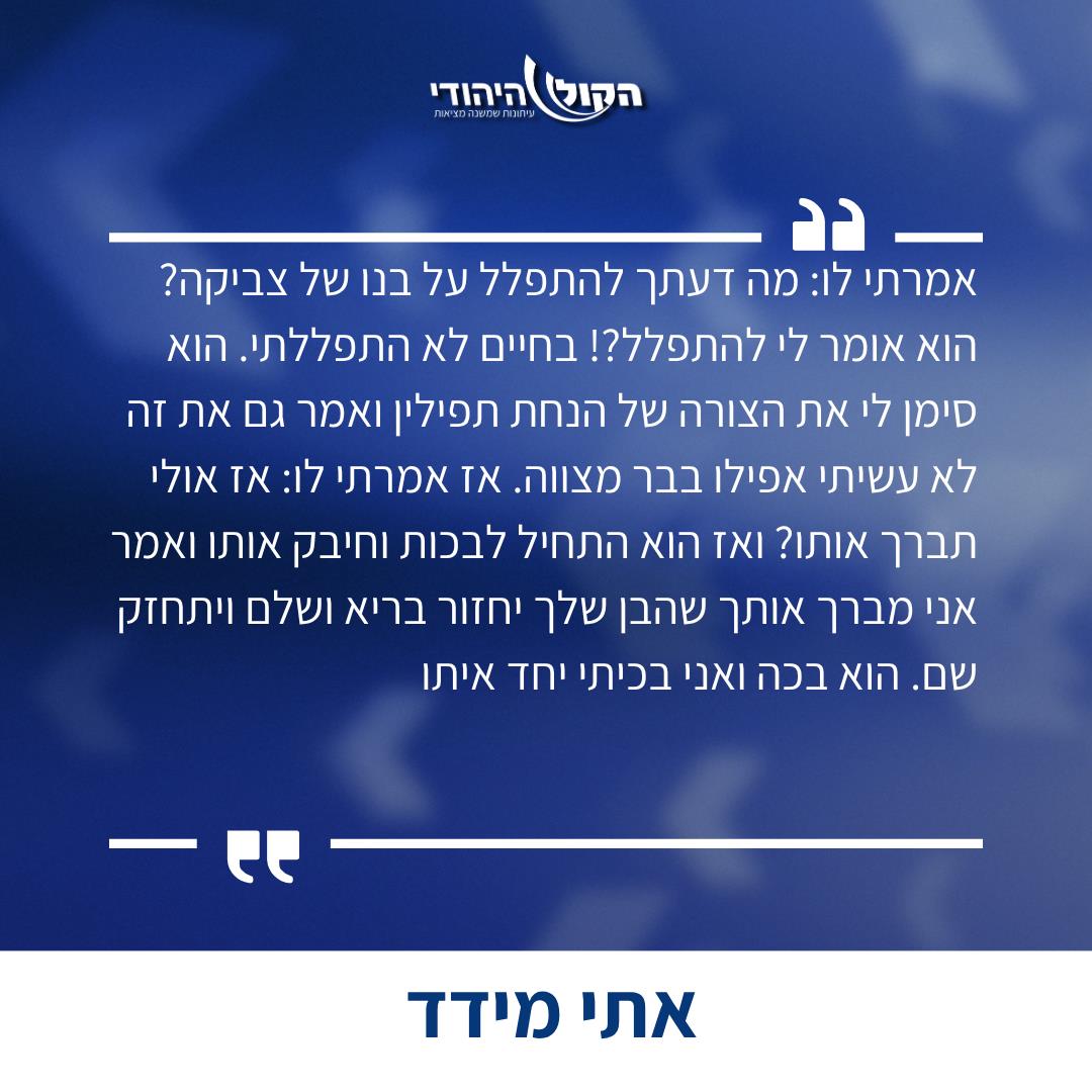 "לקראת סוף השיחה אמרתי לו: מה דעתך להתפלל על בנו של צביקה? הוא אומר לי להתפלל?! בחיים לא התפללתי. הוא סימן לי את הצורה של הנחת תפילין ואמר גם את זה לא עשיתי אפילו בבר מצווה. אז אמרתי לו: אז אולי תברך אותו? ואז הוא התחיל לבכות וחיבק אותו ואמר אני מברך אותך שהבן שלך יחזור בריא ושלם ויתחזק שם. הוא בכה ואני בכיתי יחד איתו. פתאום התגלו הפנים היפות של עם ישראל".